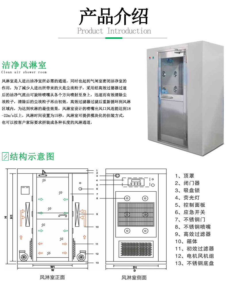 风淋室是一种通用性较强的局部净化设备,安装于洁净室与非洁净室之间。当人与货物要进入洁净区时需经风淋室吹淋,其吹出的洁净空气可去除人与货物所携带的尘埃,能有效的阻断或减少尘源进入洁净区。风淋室/货淋室的前后两道门为电子互锁,又可起到气闸的作用,阻止未净化的空气进入洁净区域。